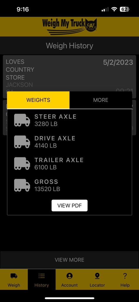 May 6: After a nice 2 day stay we packed up and left Illinois. Ever since leaving home I had been concerned that we might be overloaded. Lugging around two adults and two dogs and all their stuff, two 40 gallon propane tanks, all the camping gear (gazebo, chairs, grilll, propane firepit, electric cords, outdoor carpets, two lithium batteries, Satellite dish and stands) along with the dry weight of my four door Tundra and a 5700# unloaded Airstream need I go on. If you have ever joined a group for a hobby like camping, RVing etc you know there are hot button topics that gets online experts wound up, For travel trailers it is the size of the TV (tow vehicle slang). The Airstream vitriol usually centers around a 1/2 ton like my Tundra or a Ford F-150 etc versus a 3/4 or one ton dually and then there is the gas versus diesel and engine brakes debate. If this is making your eyes glaze over I get it. Buuuuutttt there is some truth to concerns about overloading a TV resulting in failure of the truck beside the road in the middle of nowhere or inability to stop in time or jackknifing or having a rollover as the too big trailer takes over and pushes the too small TV into trouble. And we were planning to go up annnnnd down some big mountains out west. So with my heart in my mouth not only about the weigh, would I have to leave the dogs beside the road along with all their stuff? The other anxiety was me entering into the domain of tractor trailer drivers who need the scales to be legal for their job versus me who might be in their way weighing my vacation mobile. Well with Jo’s help navigating around all the vehicles and one way exits I weighed the truck and got out of there before any complaints by truckers. And the weight of my truck was 7420# and the trailer 6100 # for a total weight of 13,520#. My max tow combined weight is 16,500#. The experts recommend to be safe you only tow at 90% max which is 14,850#. Good to go! Dogs are still with us.