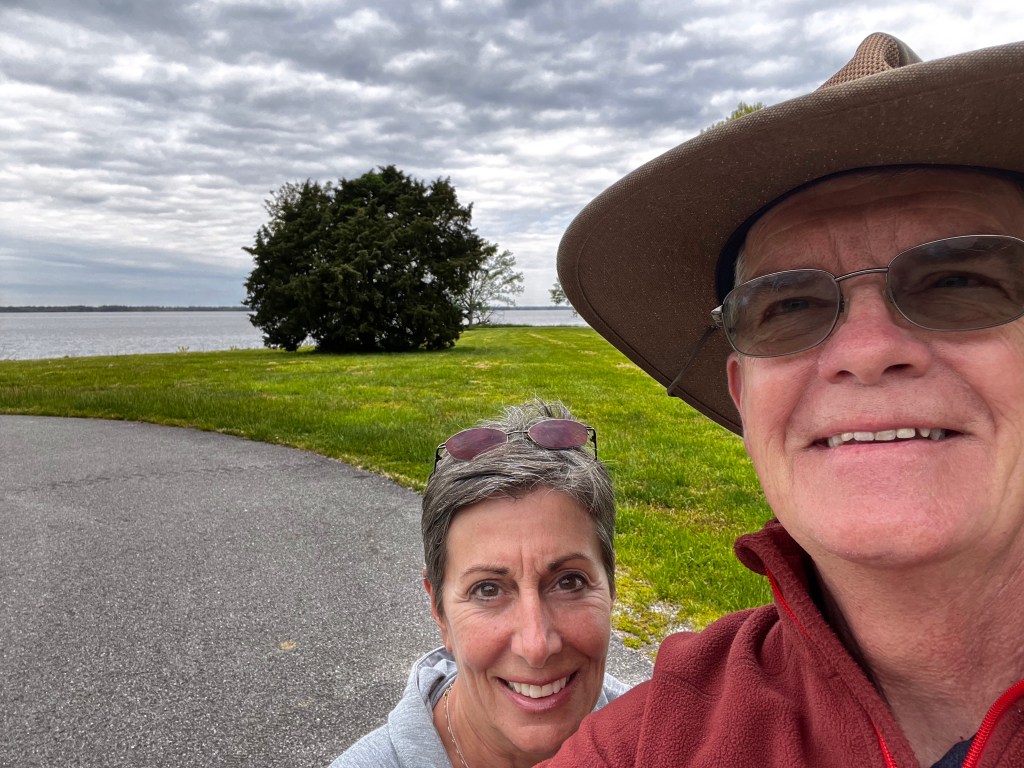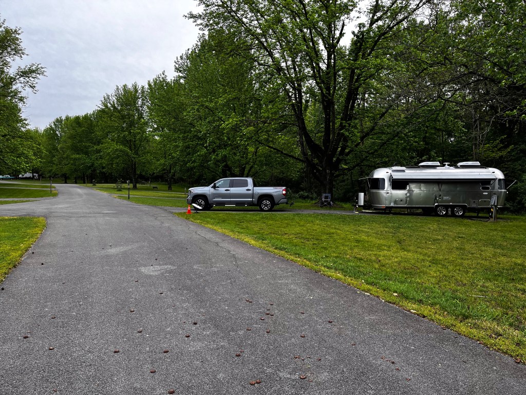 May 4: Well with a heavy heart but excited to see new places we left River life Resort and the Tennessee River on Day 5 of our trip. We managed to climb out of the campsite without difficulty and headed out to Illinois. The trip to the Wayne Fitzgerell Recreation Area was uneventful but long travel day of about 7 hours including breaks, This site was next to the lake with water views. Beautiful site but the infamous brown spiked balls returned and this time were harder and more uncomfortable for the dogs, We determined that these were coming from sweet gum trees found in the south and as far north as you guessed it, Illinois. This site had electricity but no water or sewer. It became clear very quickly that we liked to use water. I had filled our fresh water take with 25 gallons when we left home and didnt want to fill to the 50 gallons our tank will hold because each gallon weighs 8 pounds. That’s 200 pounds more to lug around. Sooooo we had to go to Walmart to pick up a 6 gallon fresh water can to lug back and forth to the fresh water tap in the campground. Now in case and of you want to stay in Illinois please know that this campground does have bathrooms and showers but they arent heated so we took quick showers in the Airstream. I am also working remotely while on this trip and actually was covering as acting Chief Medical Officer rather than my part part time usual job. This means I needed to have fast internet for video meetings. If you look at the picture of our site you can see a orange traffic cone near my Starlink dish. Well even with that I wasnt getting consistent enough speeds to do a video call. Sooo as a former Boy Scout and MacGyver wanna be I drove my truck to a clearing by the lake, put the dish on top of my truck and using a plug in 12V to 110 AC inverter for my laptop and a portable 300 W battery supply for my dish and voila I ran the meeting in my truck. I thought I was retired.