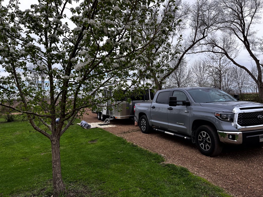 It was great to get off the wavy rough cement and park when we got to our campground. Checking in with the very nice owner I learned they also lived in Florida in the winter. They left for their home in South Dakota in April and had several feet of snow on the ground when they got to SD. When we were there it was in the 80’s, fruit trees were in blossom at our campsite and no bugs. Oh and she gave me two chocolate cookies as a welcome gift. My favorite. Oh and the title above refers to the name of the campground, Dakota “Sunsets” RV Park and Campground. Great overnight spot.