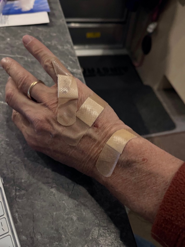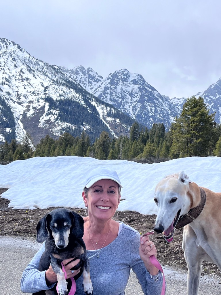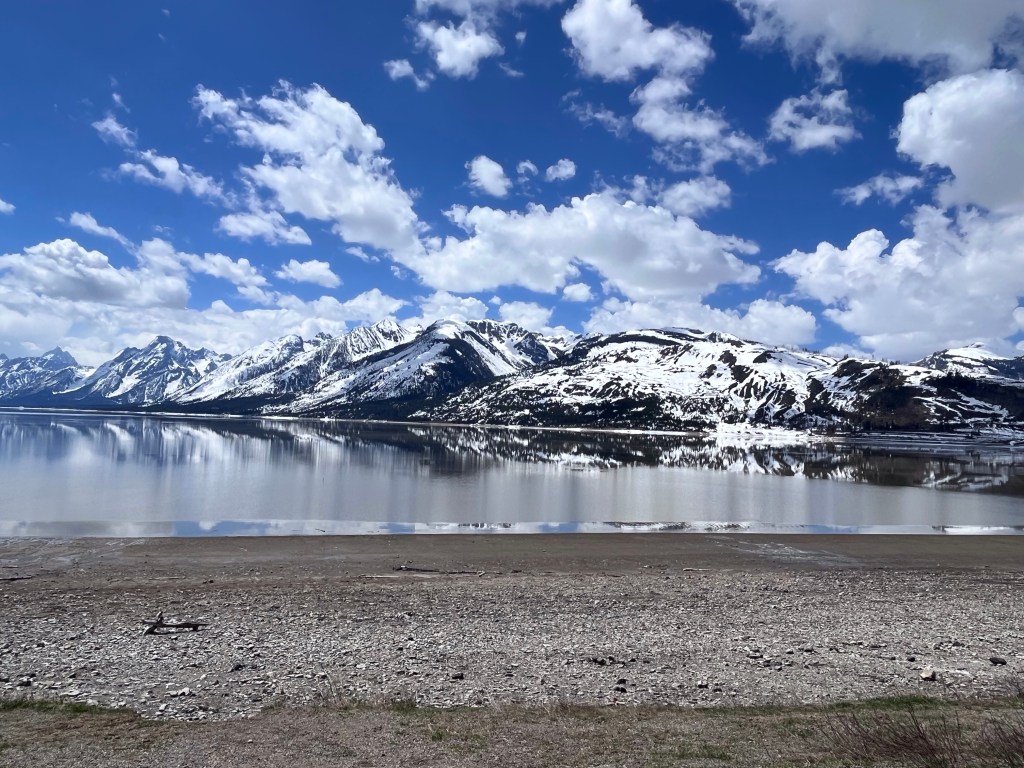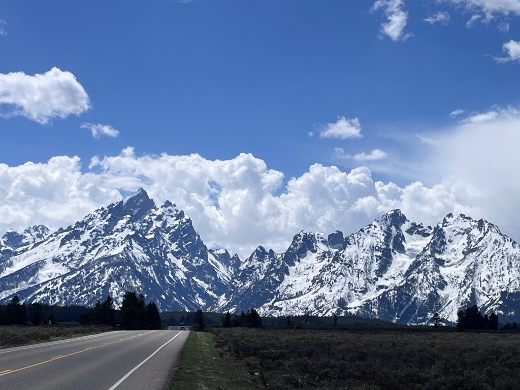 May 16: Day 4 in Yellowstone started out with me running a 10 o’clock video meeting for my part part time job. After that it started hailing and raining but Mr optimist wrassled a very tired (heat adjustments I make during the night still do keep poor Jo awake) Jo out the door and off we went to today’s destination, The Grand Teton National Park just south of Yellowstone. When I say just south nothing out here is “just”. It’s just very big out here. We drove about two hours through some beautiful landscapes. Once at the Grand Tetons I have to say they were indeed “Grand”. One of the peaks “Grand Teton” is the second tallest peak in the U.S. at 13,775 feet. The mountains are continuing to be pushed higher with major earthquakes arising from the Teton fault line. This fault line is capable of generating a 7.5 magnitude quake. I read this after I came home but felt no tremors beyond those I had after I walked into my trailer hitch that sticks out about 1 1/2 feet. I was still gazing at my pictures and turned to walk around the back of my truck and walked into it. I fell skinning multiple areas on my right hand and knee along with a bruised/sprained left fifth finger. Thankfully being the frugal person that has kept every first aid kit from every car that came with one so I had antiseptic scrub and bandages. My pride was the worst of all the injuries as I laid on the ground for a few seconds to assess the damage with bystanders at a scenic overlook. I thought they meant I should make a scene. Oddly no one came over to see if I was OK though I hustled off quickly,