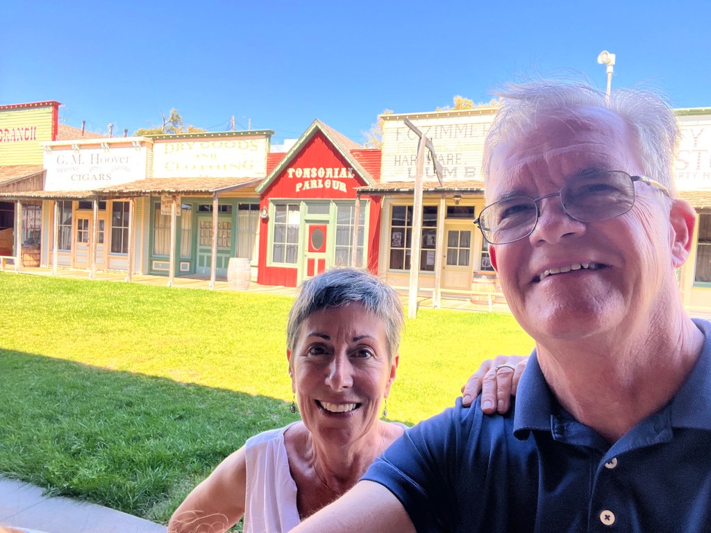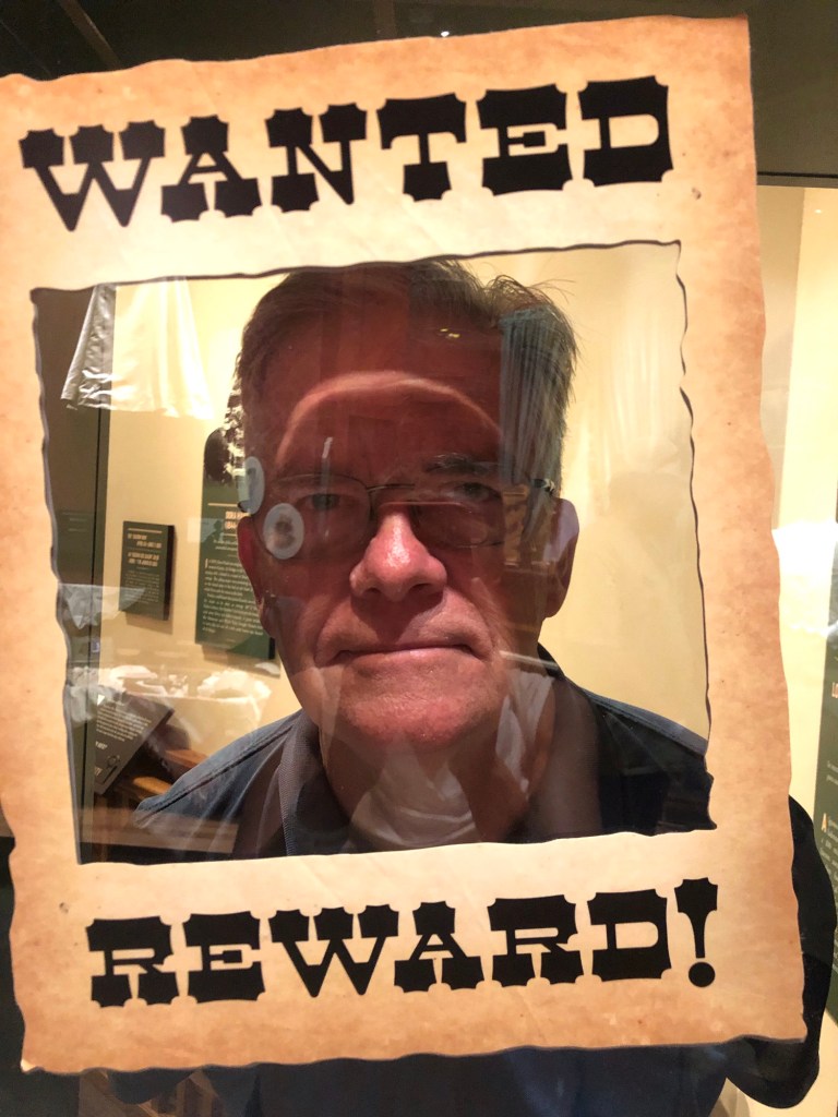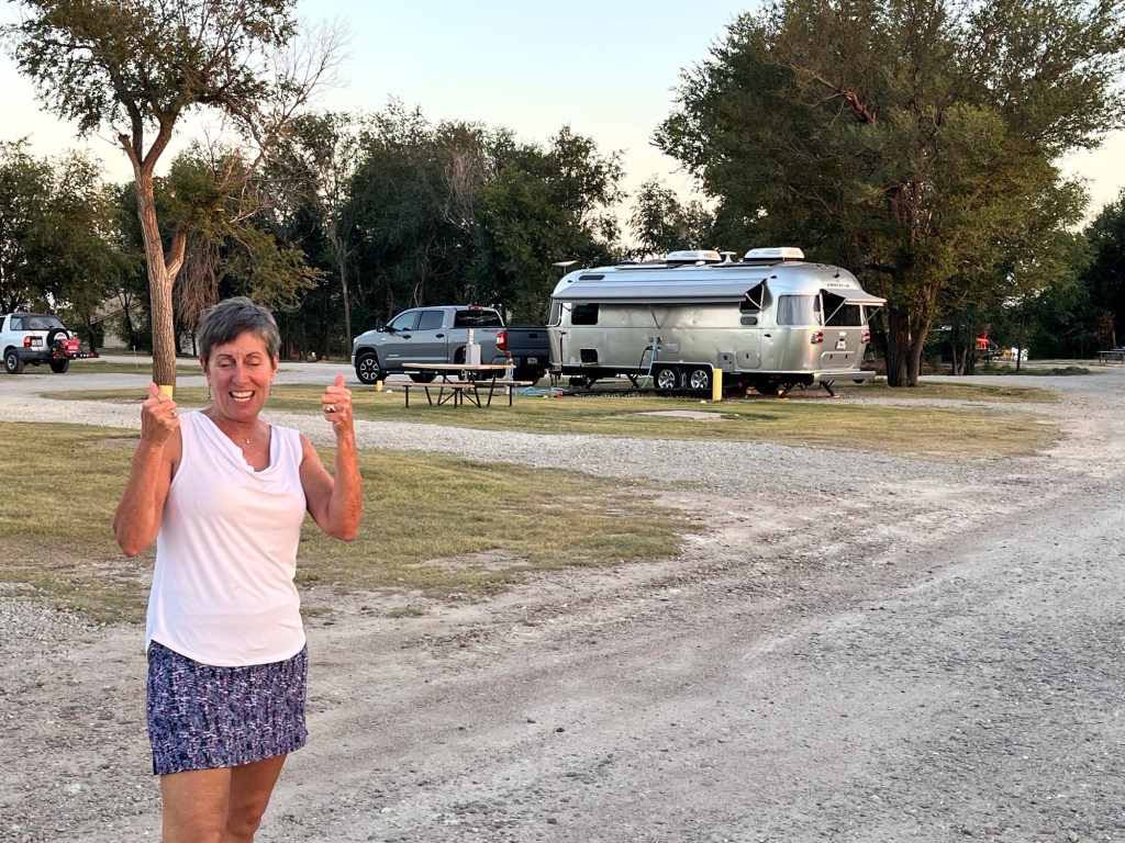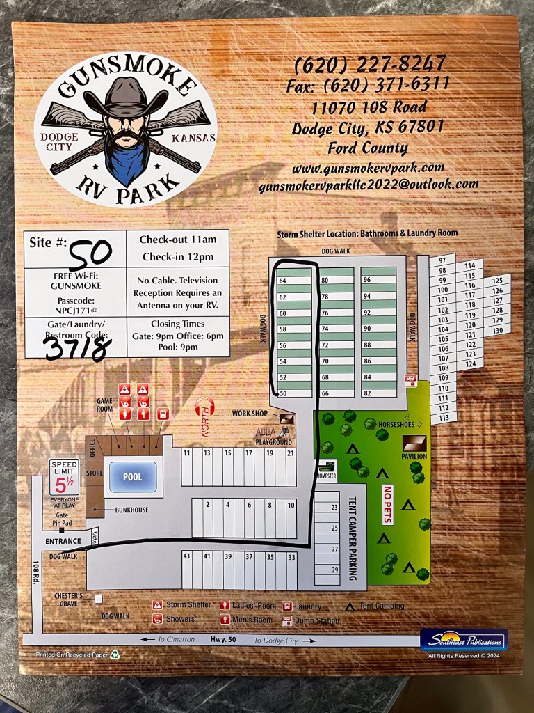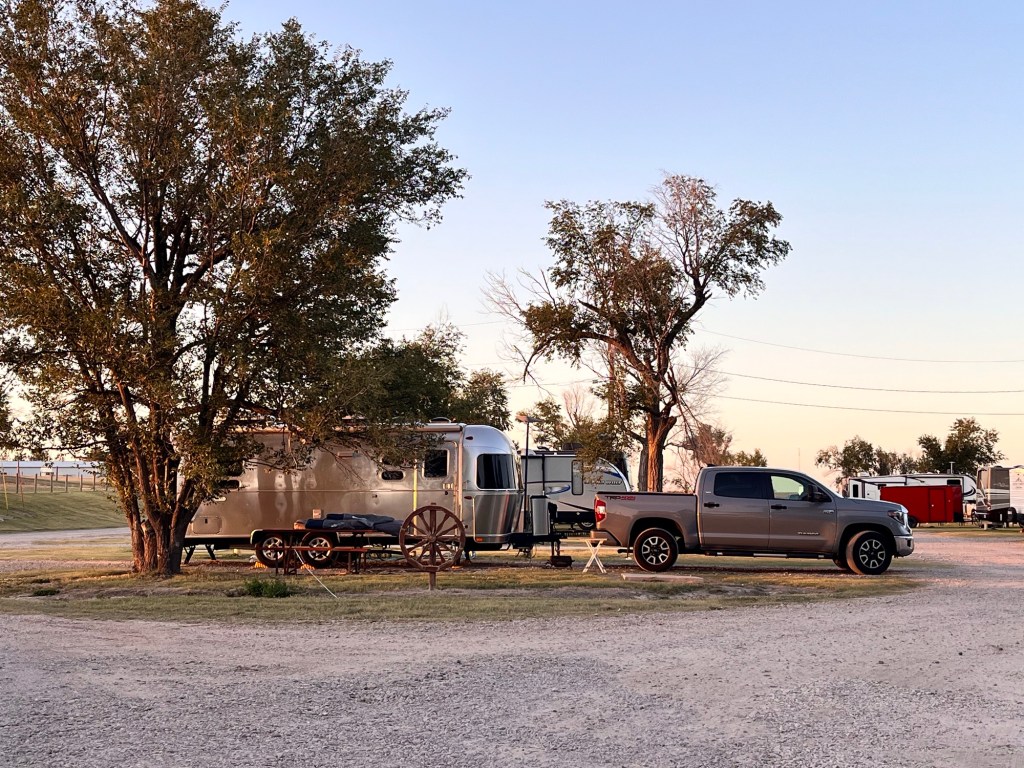 Today’s trip was 279 miles of decent roads though still a lot of noisy cement roads. We arrived mid afternoon at the “Gunsmoke RV Park”. If you havent read my first trip blog you should to check out Bucks Lake the hidden Gem that should have remained Hidden lol. To date on this trip this RV park though rated the best in Dodge City was similar. We pulled in to a paint peeling faded entrance sign park to major trench digging. The person checking us in ran over to the office when he saw us arrive and apologized for all the construction but a pipe broke the day before and he was repairing it. “But your part of the park and water supply is safe to drink! He proceeded to mark on the campground map where to drive to our site away from the construction and then proceeded to tell me not to go where he marked but in the out lane. We headed off in a cloud and I mean a big cloud of dust to our site which as it turns out was one of the best sites. And as Jo said “we even had a wagon wheel” and a tree. I dont think we have ever been in a dustier campground that combined with first a breeze then a steady wind kept our equipment covered in sand. Have you ever seen cowboys wear bandanas over their face even when they werent robbing a bank. Now I know why.