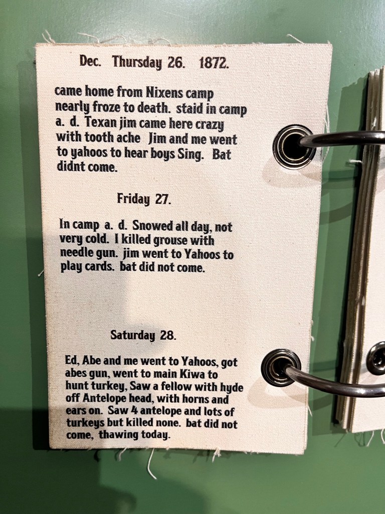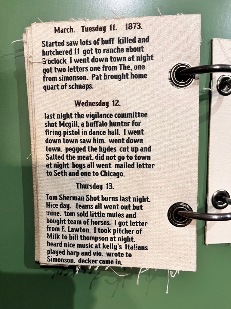 One of the fascinating things in a great museum a Boot Hill was a diary of a man Henry Raymond. He chronicled his work hunting buffalo with Bat Masterson and his brother Ed Masterson. I found it fascinating for what they endured, the fact that Bat wasnt a socializer (see diary picture) and that shooting someone was just another day in the life.