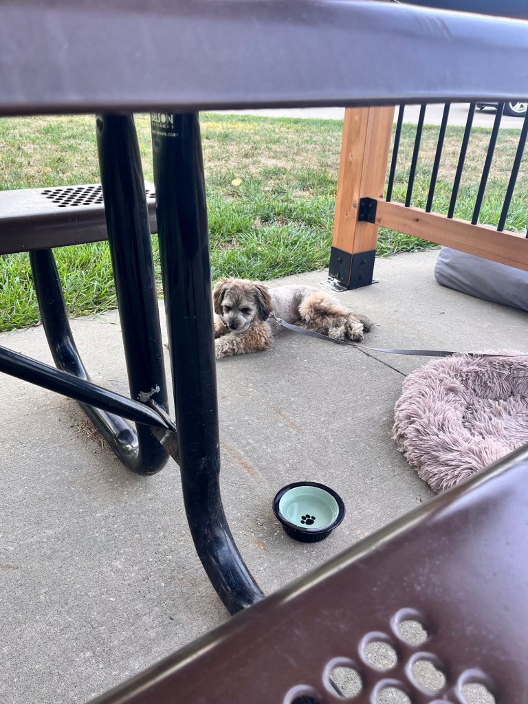 This campground was nice with cement parking pads and covered shelters with sun shades at every site. Very nice for an overnight. One thing I dont think Ive mentioned that all the Midwest RV campgrounds have is a storm shelter. They dont want us flying over Kansas and landing on witches I guess. And your little dog!!!!