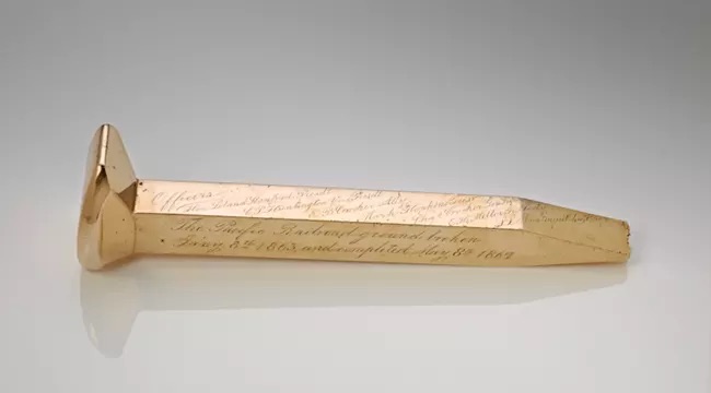 After the spikes were driven the RR tie and spikes were removed and a regular pine tie and 3 iron spikes were driven in. The fourth and final spike was wired transcontinental telegraph line so the nation could hear the blows as it was driven in.