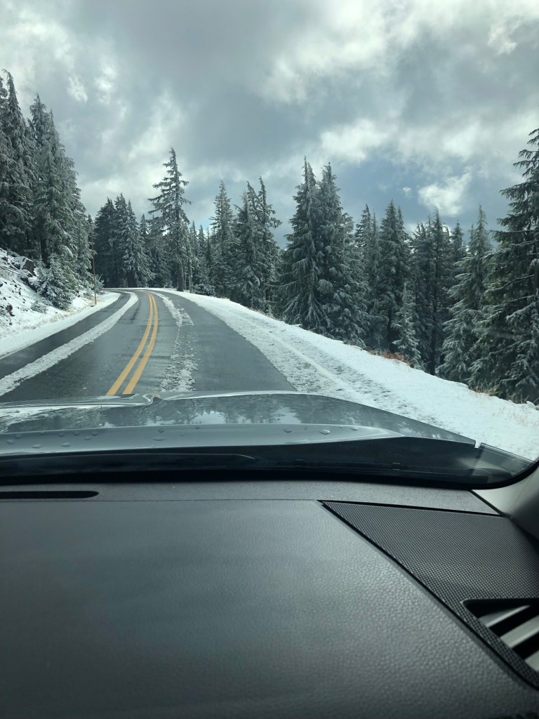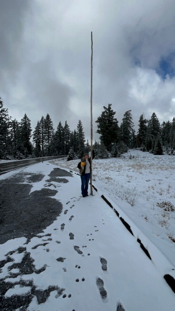We awoke to the pitter patter of rain drops the next AM. More like a drum beat when you are in a drum lol. And it was cold. I went to the office to get a “smart card” for the laundry which was actually a great idea rather than fumbling with quarters. You just load it with x dollars and turn it in when you leave to get any unused money back. While I was there I mentioned the cold rain and wondered if they had seen any snow this season. She said no but that it was snowing up at Crater Lake. And it was! As we climbed to the 7000 foot plus elevation the temperature dropped and it began snowing with more and more of the white stuff on the trees and then the road. Have I mentioned that Westerners clearly must have a “we dont need no stinking guard rails” motto. 100 foot drop offs right by the road and no guardrails. Oh and like always during the first snow people drive like its dry pavement til that first loss of grip “OH S%$T” moment. While going up people were coming down hairpin turns at 40-50 mph on a 25 mph dry road speed limit road. But we kept going as there are also no turn arounds. But it was beautiful.