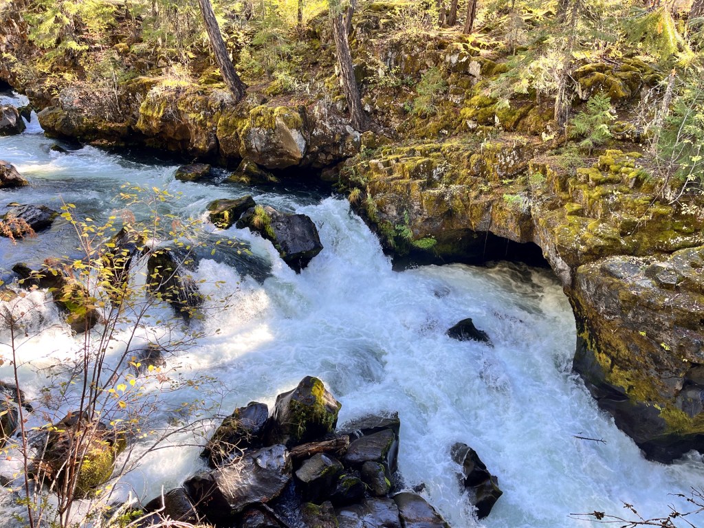 The next day we went to see the Natural Bridge formation on the Rogue River near us. Lava tubes form tunnels in the rocks and the river disappears into these and then reappears creating a natural bridge that early people used to cross the river. This was one of the first attractions out west that actually had some fencing and guardrails! That said this was the first attraction that had a memorial cross for someone that had died there. Fencing looked new!