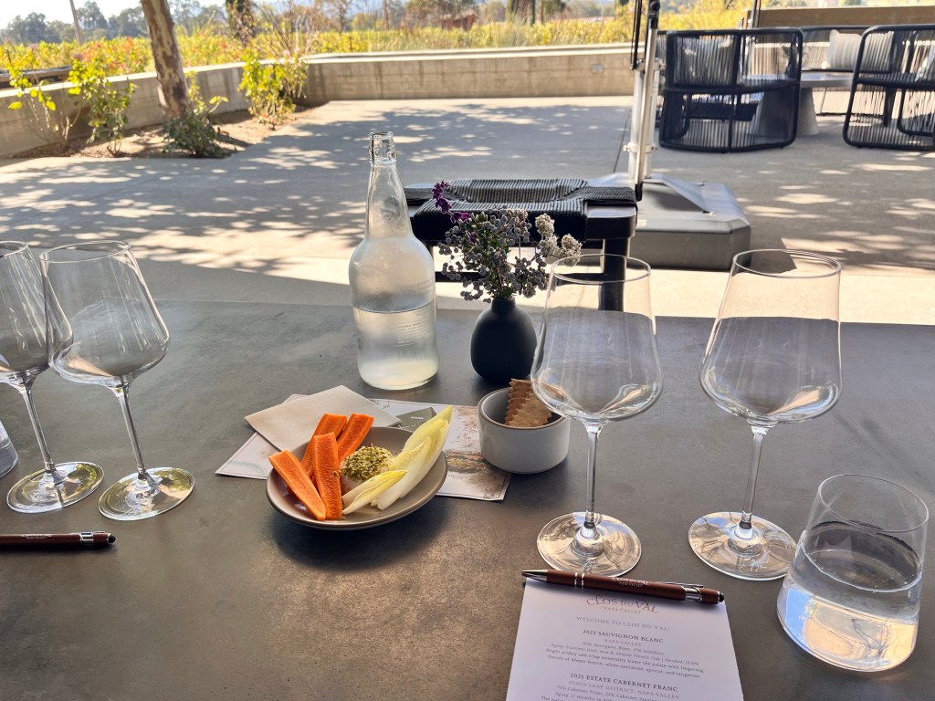 The next day we headed out to see the wine growing areas. And took a wrong turn and gave up lol since we had a reservation for noon at the Clos Du Val winery recommended by friends. We took a right turn and found the winery with time to spare. The reservation said there could be 1-6 people but ours was just for us two in turned out. We had a nice young lady sommelier who wasnt wine snobbish and answered all our first time questions and then some. The wines we tasted were blends which I didnt know was a usual thing but for this winery was. We started with a white and then 4 reds. I didnt finish all mine as I was driving but Jo did lol. The setting was what I think Italy would look like…….just beautiful. Oh and the dip they had to eat with veggies and crackers was to die for. Cream Cheese, Feta, topped with ground pistachios, honey and 100% sure garlic was involved lol. Mmmm