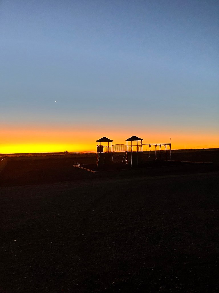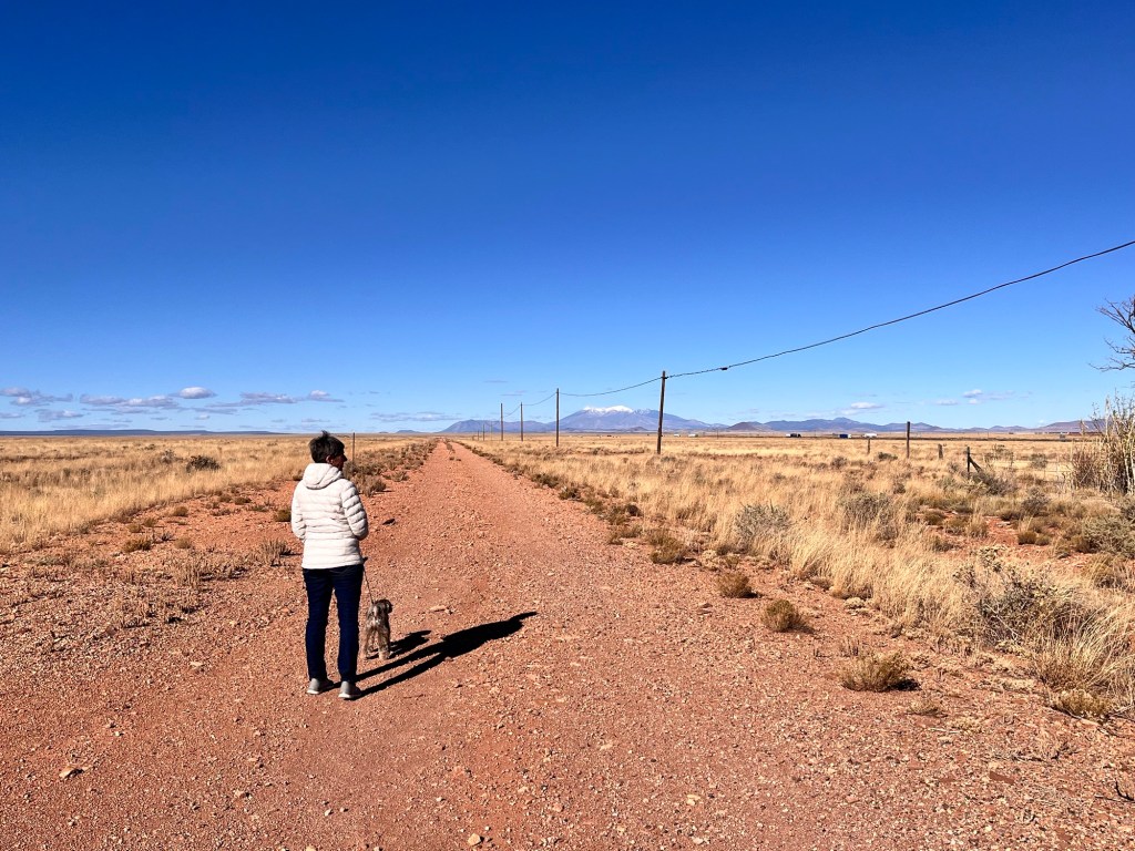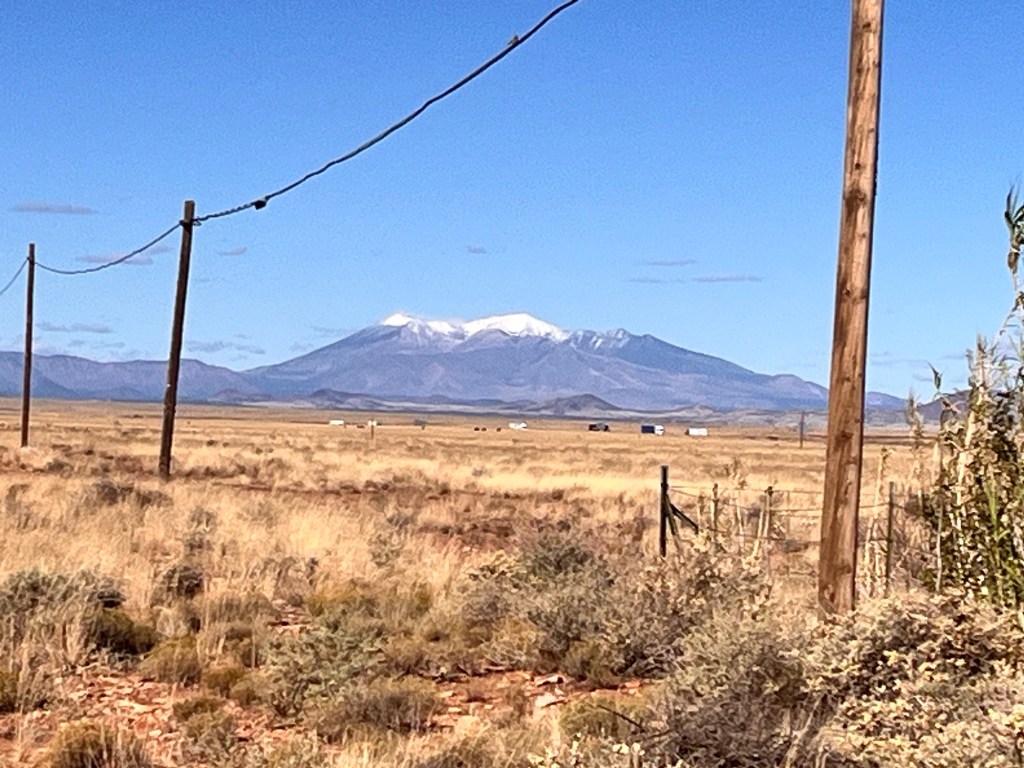 After a sleepless night we headed to our next stop Meteor Crater RV Park near Flagstaff and Winslow Arizona. Todays trip was about the same number of miles 365 so a long trip but all Interstate so only 6 hours plus rest stops. More high mountain passes and wind but as we got into Arizona we started to climb to 6-7000 feet and evergreen forests dominated. Oh and Humphreys peak at 12,000 feet above sea level loomed large with its snow covered peak. We had been to Flagstaff with friend before and I remembered how beautiful it was aside from being locked out of our freezing rain covered car that we had left running to melt the snow. But that’s another story. Met a nice locksmith who said all the rental cars from Las Vegas self locked themselves and kept him very busy. When we called the rental company they said oh yeah they do that and the spare key is in the glove compartment. But I digress. Another 20 minutes and we arrived at the Meteor Crater RV Park. This park was also in the middle of a verrry wide open prairie but it had trees and was quite beautiful. After an easy check in and a free discount coupon handed out by the front desk to see the crater, we went to our site and set up for the night. Easy peasy.