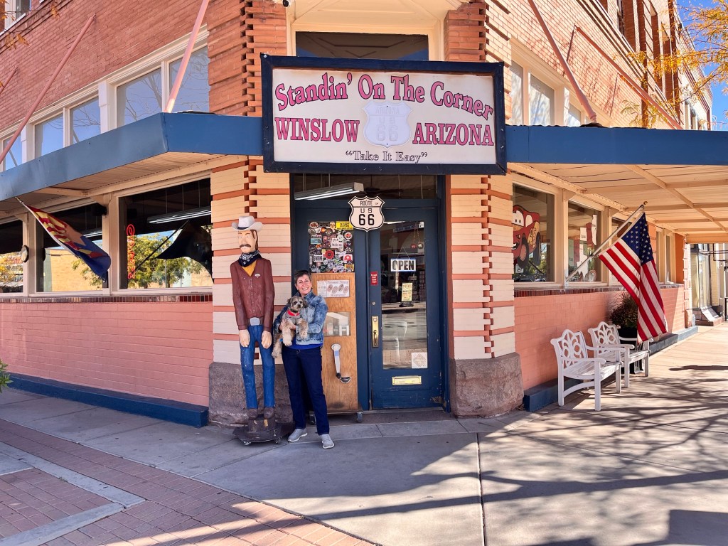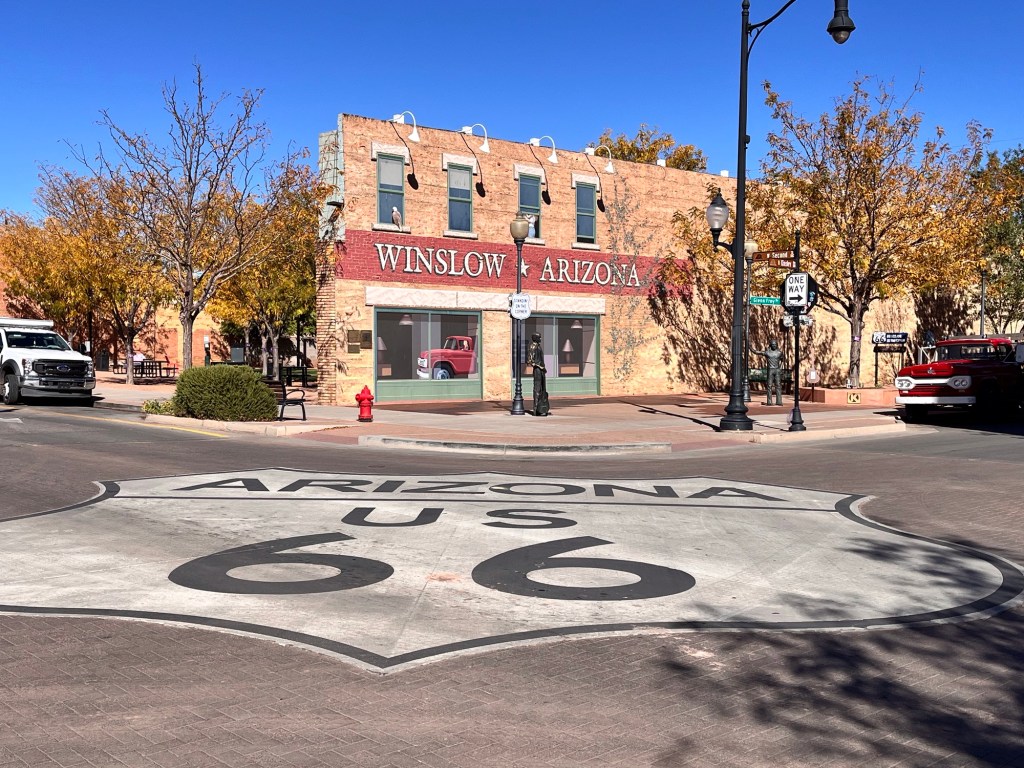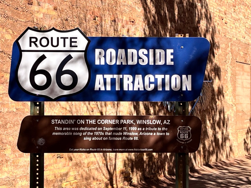 The next AM we went into Winslow to see Route 66 and the corner in the Eagles song “Take it Easy” where the singer was standing when a girl in a flatbed Ford slowed down to take a look at him lol. There is some debate about where it actually happened to the lyrics writer Jackson Brown when his car broke down but Winslow has capitalized on it. I suspect the town struggled when I-40 bypassed it and made Rt66 a memory but they have capitalized on it though the town still looks a bit forlorn once out a ways from the famous corner. But it does have a Walmart where we restocked after checking out the cool corner and associated souvenir shops on opposite corners. But very cool to see it.