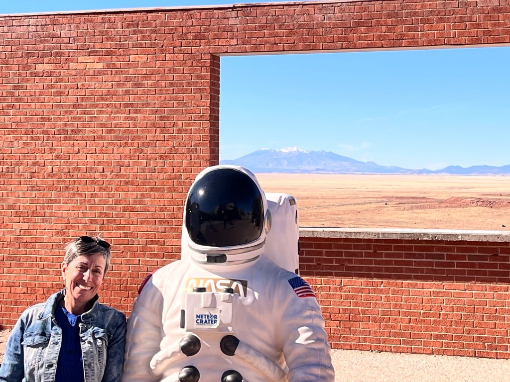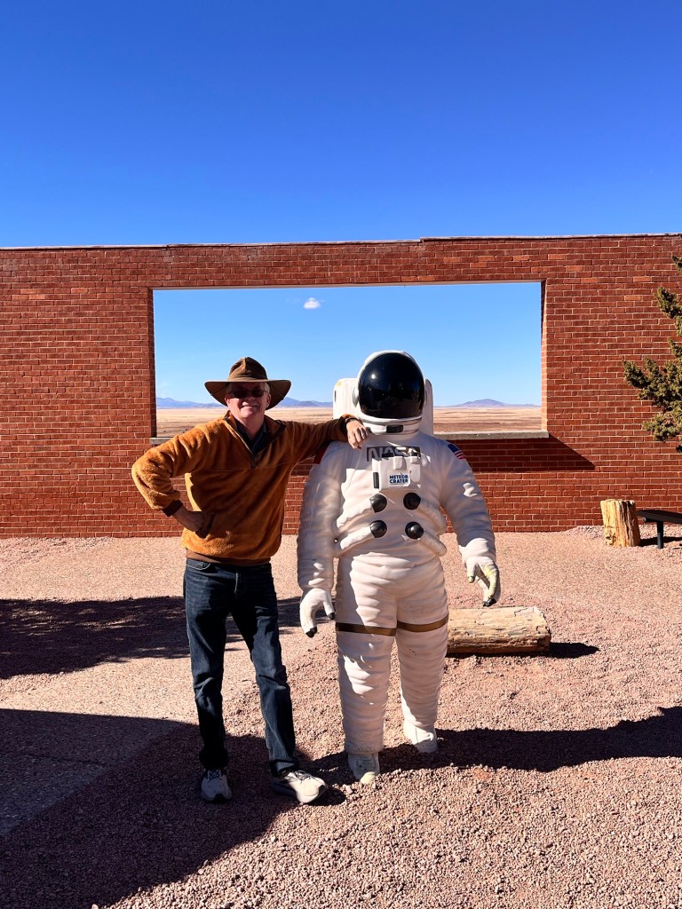 Well after a nice visit with movies, a 4D ride (who knew) to a rogue asteroid we had to blow up to prevent an earth impact and a very nice museum visit, we headed back to the campground as we were off the next day for SantaFe, NM. Oh and bottom line the crater was never a succesful Iron mine but it is definitely a tourist “gold mine”