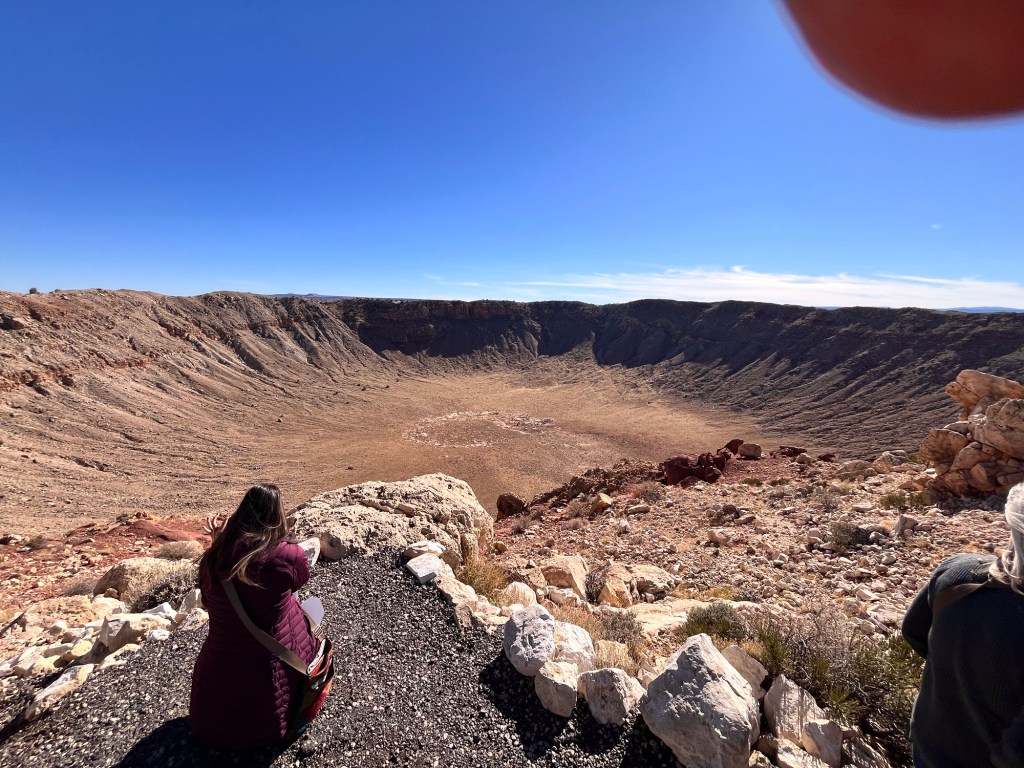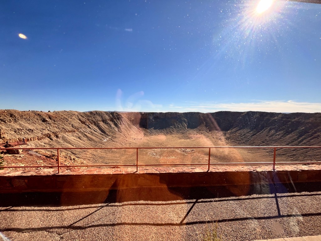 A couple of interesting tidbits is that two commercial airline pilots flying in a Cessna went over the crater after fueling up in Winslow and were sucked into the crater by downdrafts and crashed. I had noticed two shiny spots on the wall of the crater and asked the tour guide who relayed the story. Both men survived with one of the pilots with a vertebral fracture dragging the other pilot who was unconscious out of the plane before it exploded. They had actually circled in the crater (yes it’s that big) trying to get up airspeed but stalled the plane trying to fly out and hit the side of the crater.
